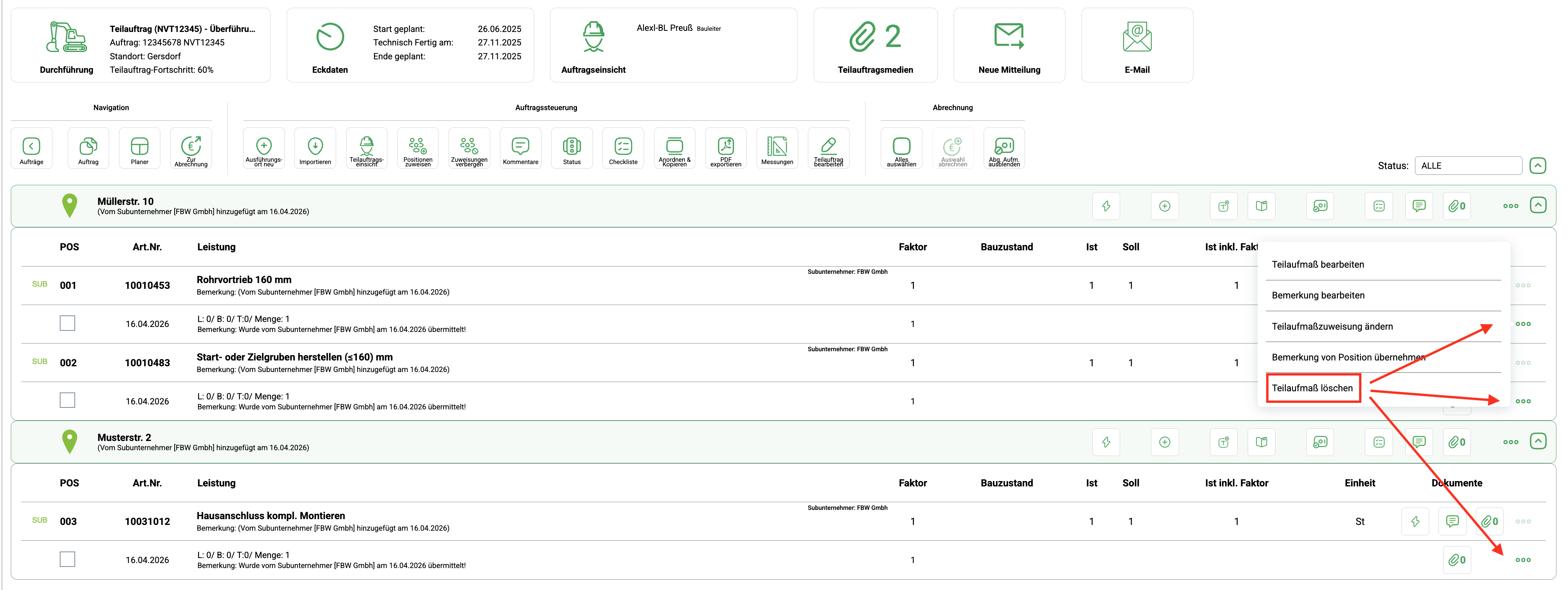 Wenn Sie das Aufmaß an den Subunternehmer zurücksenden möchten, müssen zuvor alle Teilaufmaße innerhalb des Aufmaßes gelöscht werden. Bitte stellen Sie dabei sicher, dass ausschließlich die Teilaufmaße und nicht die Position gelöscht werden.