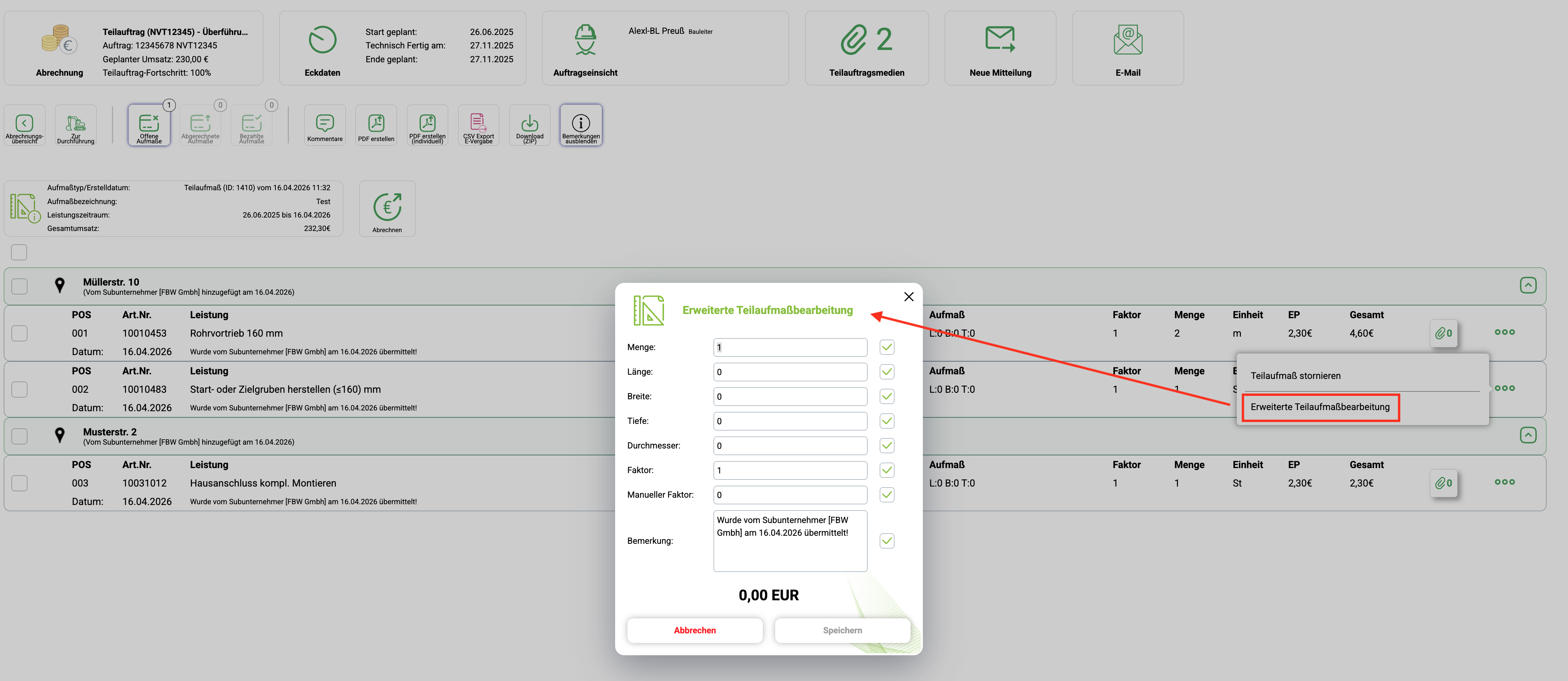 Diese Funktion ermöglicht Korrekturen eigenständig im Aufmaß vorzunehmen ohne das Aufmaß an den Subunternehmer zurückzusenden.