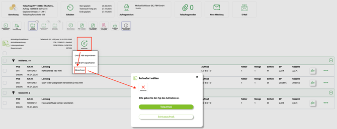 - Hierbei öffnet sich ein weiteres Fenster. Jetzt haben Sie die Auswahl ein Teilaufmaß oder ein Schlussaufmaß zu erstellen. Klicken Sie auf das jeweilige Feld.