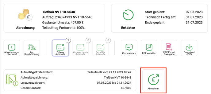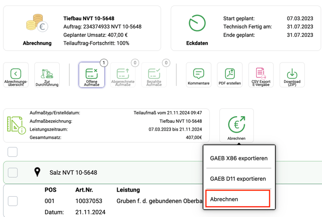 Abrechnungsaufmaß mit Auftraggeber abrechnen (Nicht Telekom)