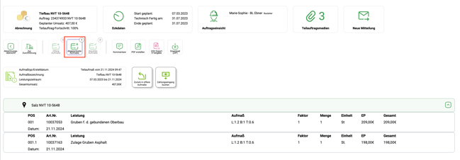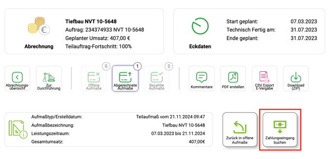 - Sobald das Aufmaß vom Auftraggeber akzeptiert wurde, klicken Sie auf "Zahlungseingang buchen".