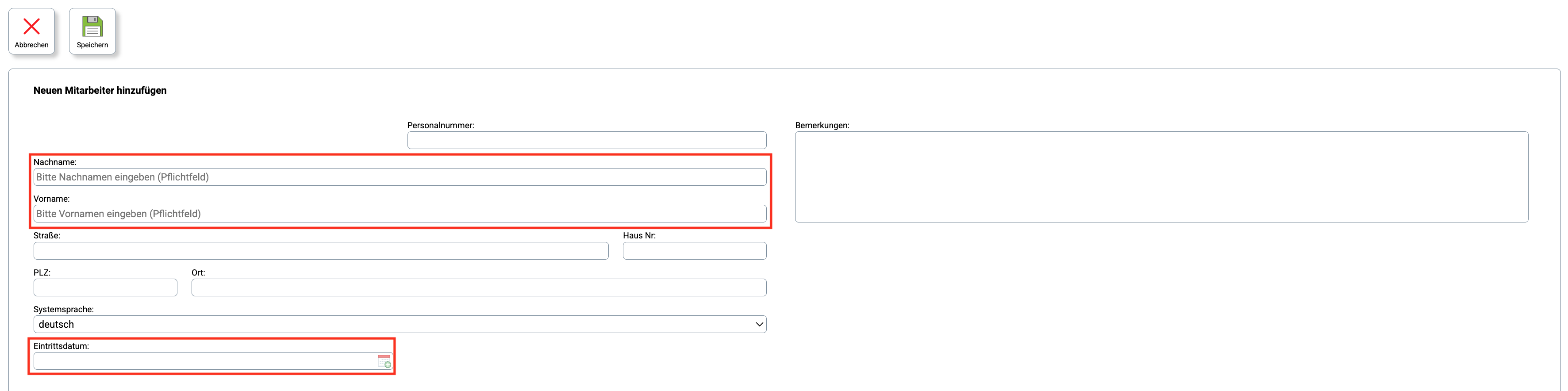 4. Geben Sie nun die Daten für den Mitarbeiter ein (Pflichtfelder wie Vor- und Nachname müssen hinterlegt werden. Damit der Mitarbeiter als "Aktiv" hinterlegt ist, empfehlen wir das Eintrittsdatum zu hinterlegen.