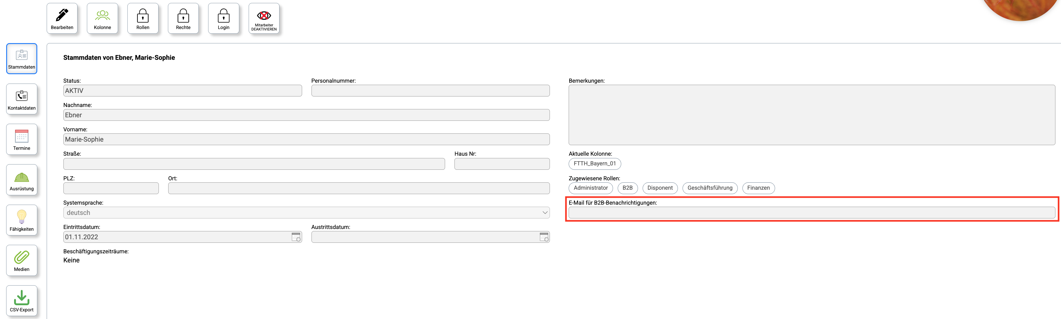 Bei Mitarbeitern, die über Änderungen in der B2B benachrichtigt werden sollen, muss zwingend bei dem Punkt "E-Mail für B2B-Benachrichtigungen" eine E-Mail-Adresse hinterlegt sein (entweder die von dem Mitarbeiter oder eine globale).