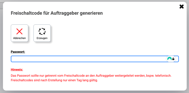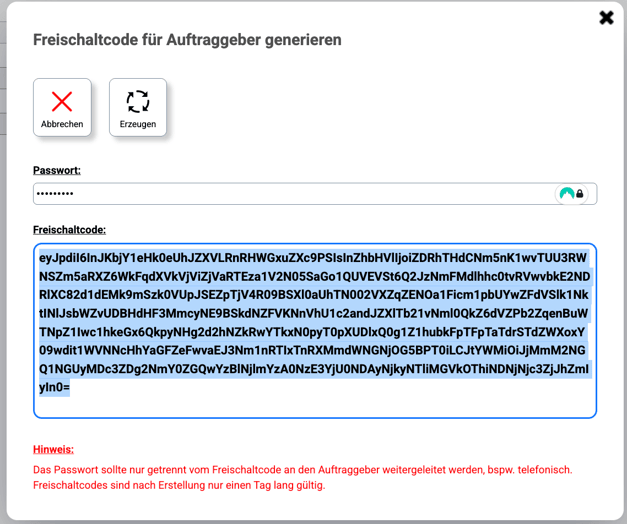 5. Kopieren Sie den Freischaltcode und schicken Sie dieses getrennt vom Passwort an den Auftraggeber. Dieser muss das Passwort und den Freischaltcode im Bereich "Subunternehmer" hinterlegen, damit die Schnittstelle zwischen beiden Systemen hergestellt werden kann.