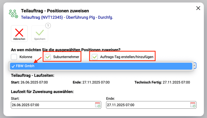 - In einem weiteren Fenster haben Sie die Möglichkeit den "Subunternehmer" über die Checkbox auszuwählen und dem Auswahlfeld direkt darunter können Sie den Subunternehmer hinzufügen.