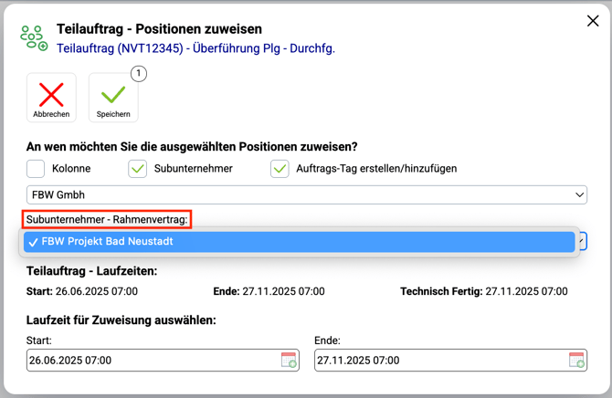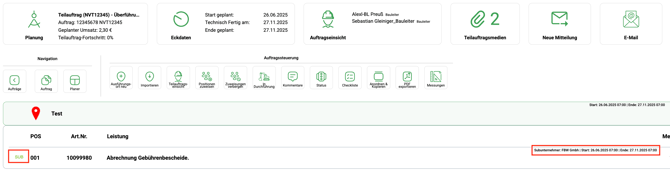 - Auf der zugewiesenen Position(en) wird Ihnen angezeigt, dass diese einem Subunternehmer zugeordnet wurden, welcher Subunternehmer dies ist und welches Start- bzw. Enddatum hinterlegt wurde.